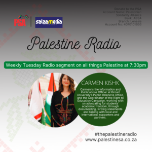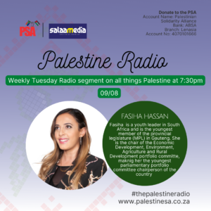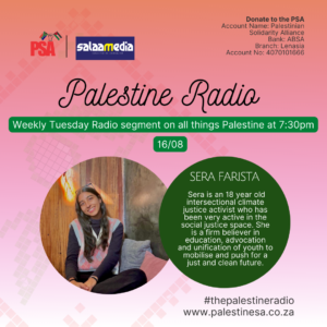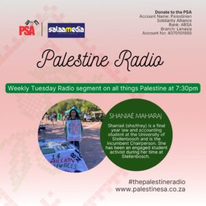 Shaniaé Maharaj (she/they) is the incumbent Chairperson of the Stellenbosch Palestine Solidarity Forum. As a student activist she has been involved in anti-racism and anti gender-based violence movements. Shaniaé believes that the Palestinian liberation struggle must be approached with the same passion (and outrage) as other movements.
