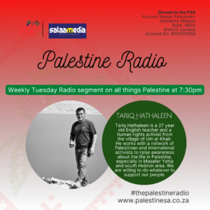 Tariq Hathaleen is a 27 year old English teacher and a human rights activist from the village of Um al-Khair. He works with a network of Palestinian and international activists to raise awareness about the life in Palestine, especially in Masafer Yatta and south Hebron area. We are willing to do whatever to support our people.