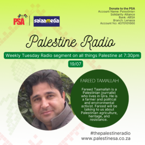 Fareed Taamallah is a Palestinian journalist who lives in Qira. He is a farmer and political and environmental activist. Fareed will be talking to us about Palestinian agriculture, heritage, and resistance.